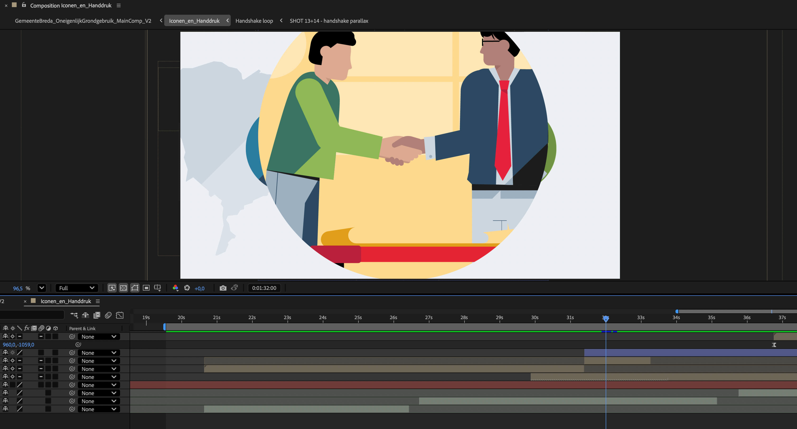 Vrijdag heb ik verder gewerkt aan de animatie van de video “Oneigenlijk grondgebruik” voor de Gemeente Breda. In de middag heeft Roel mij geholpen met het animeren van de wat complexere onderdelen, zoals een handdruk en de character animation. Aan het einde van de dag stond er al een goede eerste opzet van de animatie.