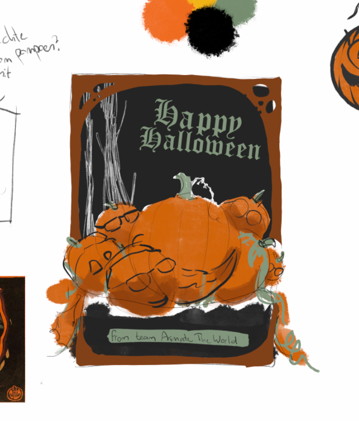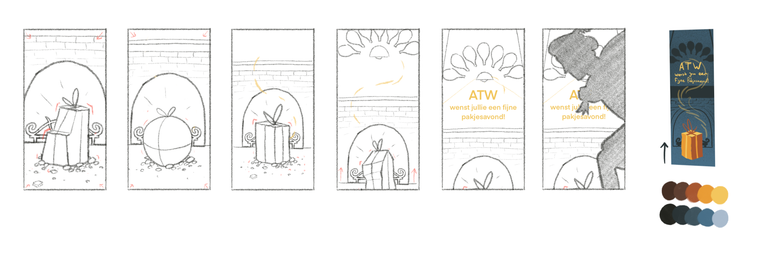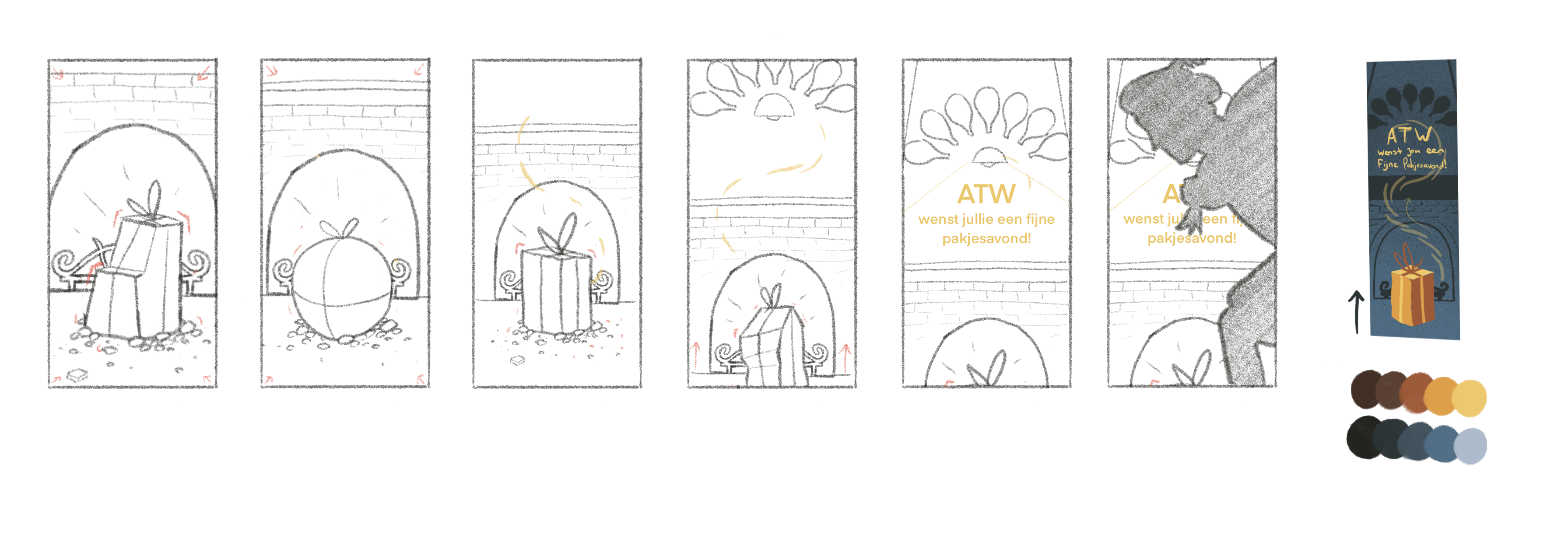 Woensdag ben ik begonnen aan een nieuw project: een social media post voor ATW voor Sinterklaas. Hierbij heb ik dezelfde werkwijze aangehouden als bij de Halloweenpost, namelijk eerst een concept maken, daarna schetsen en een storyboard opstellen, vervolgens illustreren en tot slot animeren.