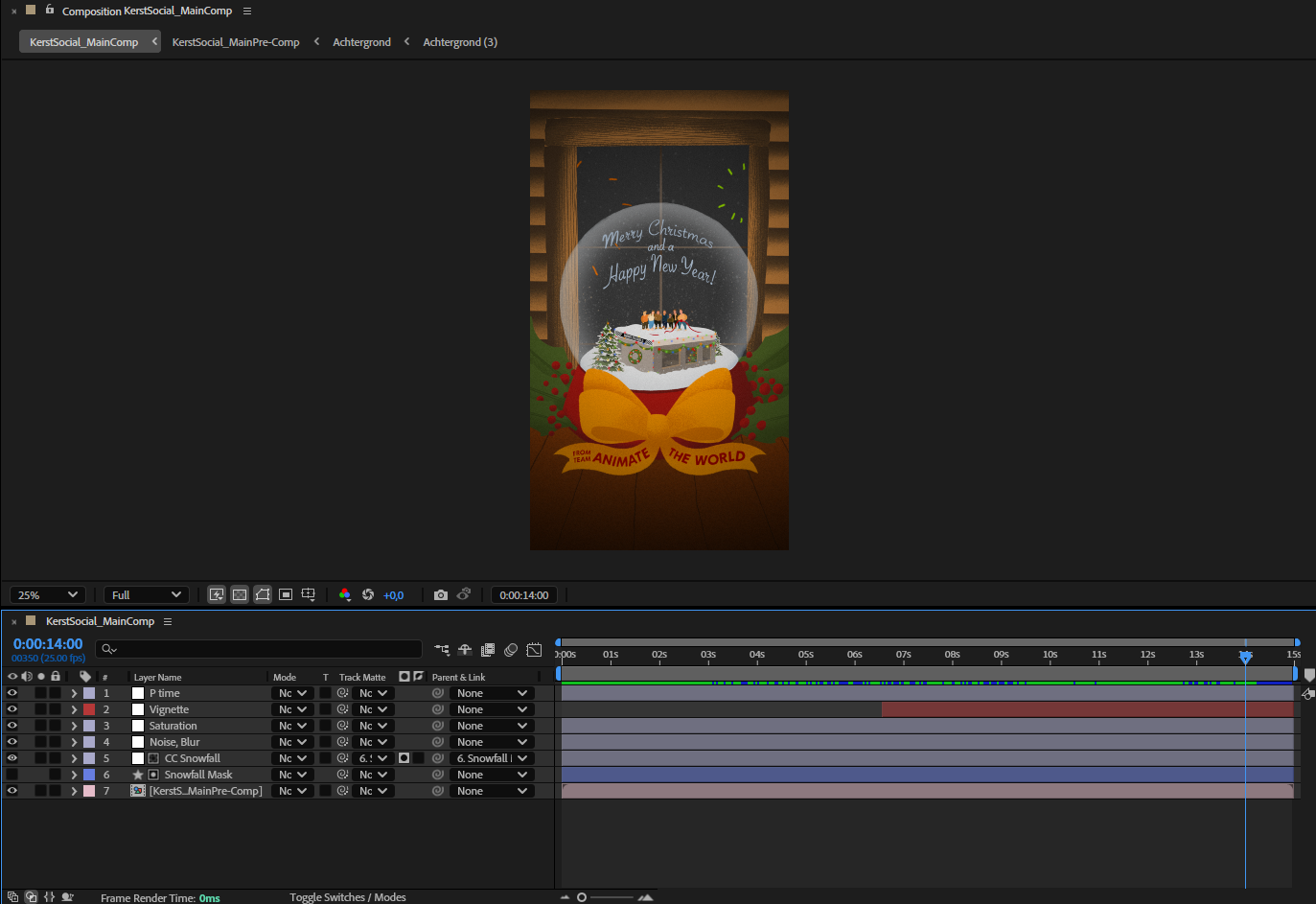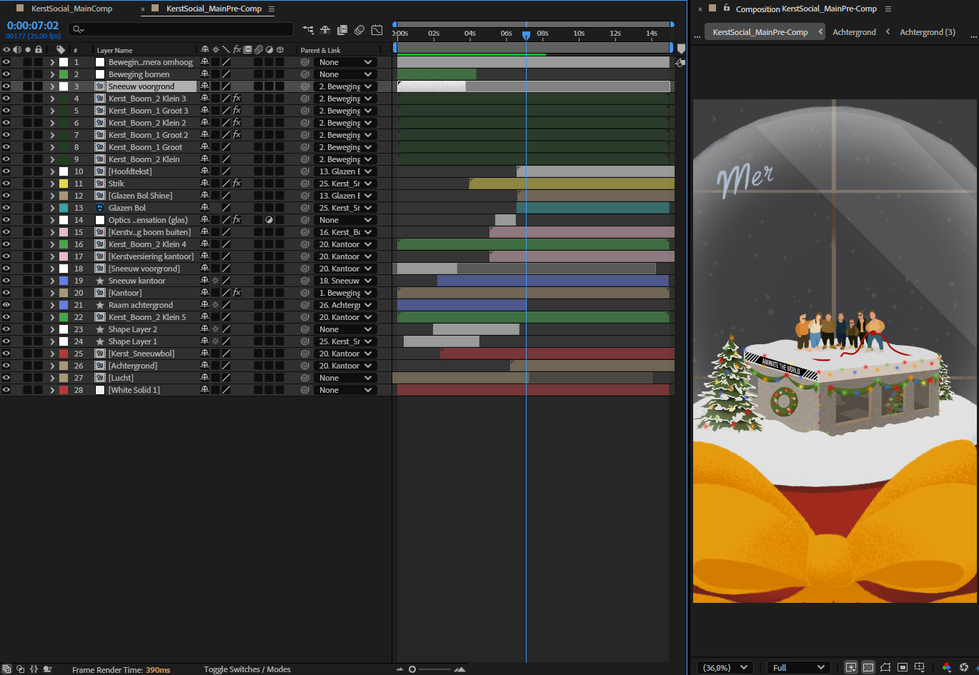 Maandag ben ik bezig geweest met de puntjes op de i voor de kerstpost. Ik heb de effecten toegevoegd die ik erop wilde hebben en de laatste feedback op de animatie verwerkt. Daarnaast heb ik de binnenkant van het kantoor gemaakt, vuurwerk toegevoegd in de achtergrond en geëxperimenteerd met een knipje in de video. Uiteindelijk heb ik die knip eruit gelaten, zodat het één soepele beweging bleef. Voor het eerst heb ik gewerkt met de effecten CC Snowfall, Noise, Gaussian Blur en Posterize Time. Aan het einde van de dag was het visuele gedeelte helemaal afgerond.