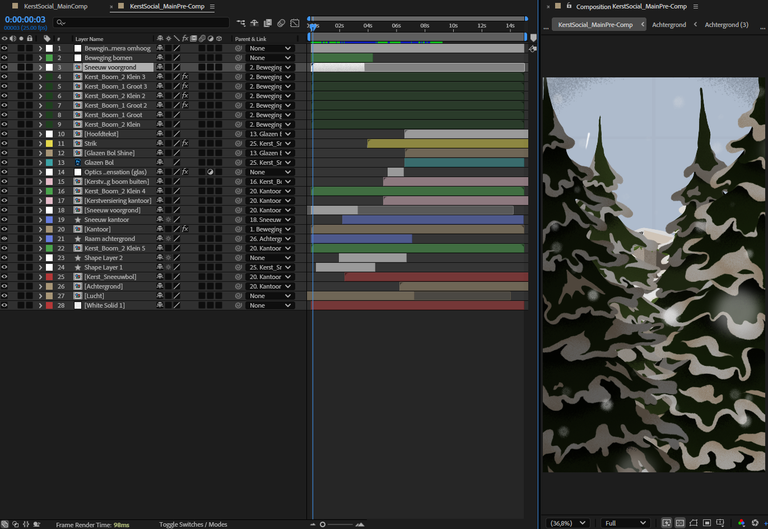 Maandag heb ik - ruim binnen mijn eigen planning - het illustreren van de losse lagen van de social media post afgerond. Dit heb ik gedaan in een combinatie van Procreate en Photoshop. Dinsdag t/m donderdag ben ik bezig geweest om dit te animeren in After Effects.