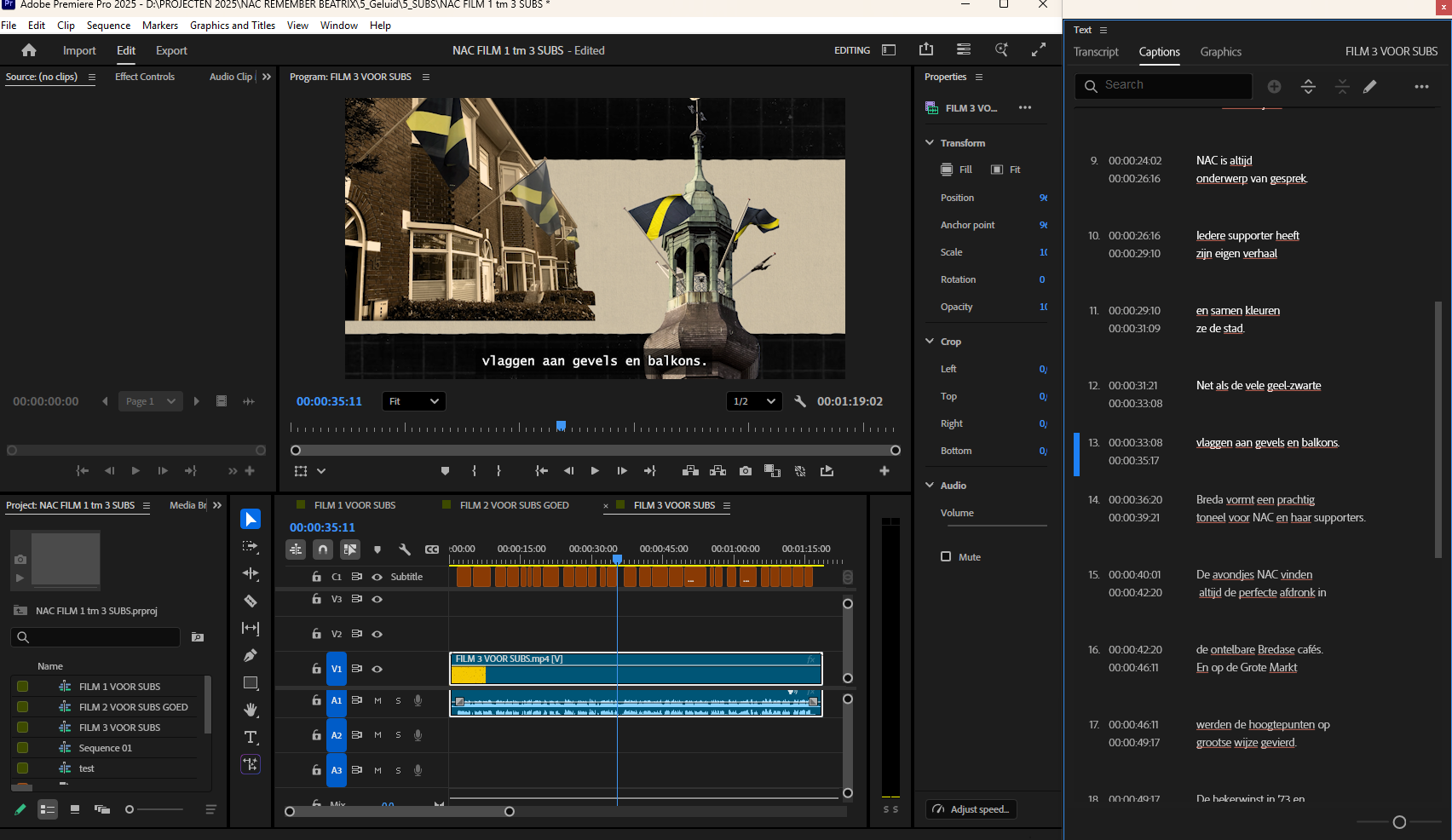 Woensdag kreeg ik nog een opdracht tussendoor die voorrang had. Het ondertitelen van de drie video's voor Remember Beatrix. Ik heb er hier dus één van gemaakt en anderen uit het team de andere twee. Deze waren helemaal af en moesten alleen nog ondertiteld worden. Dit heb ik gedaan in Premiere Pro.