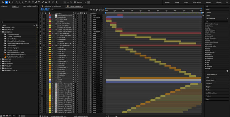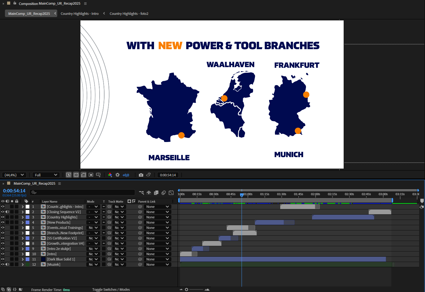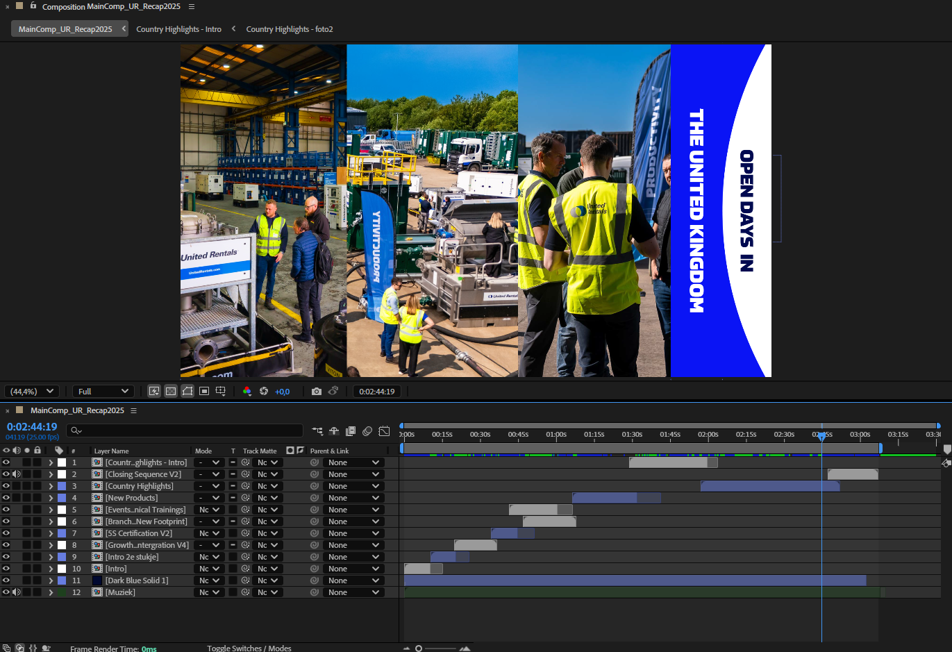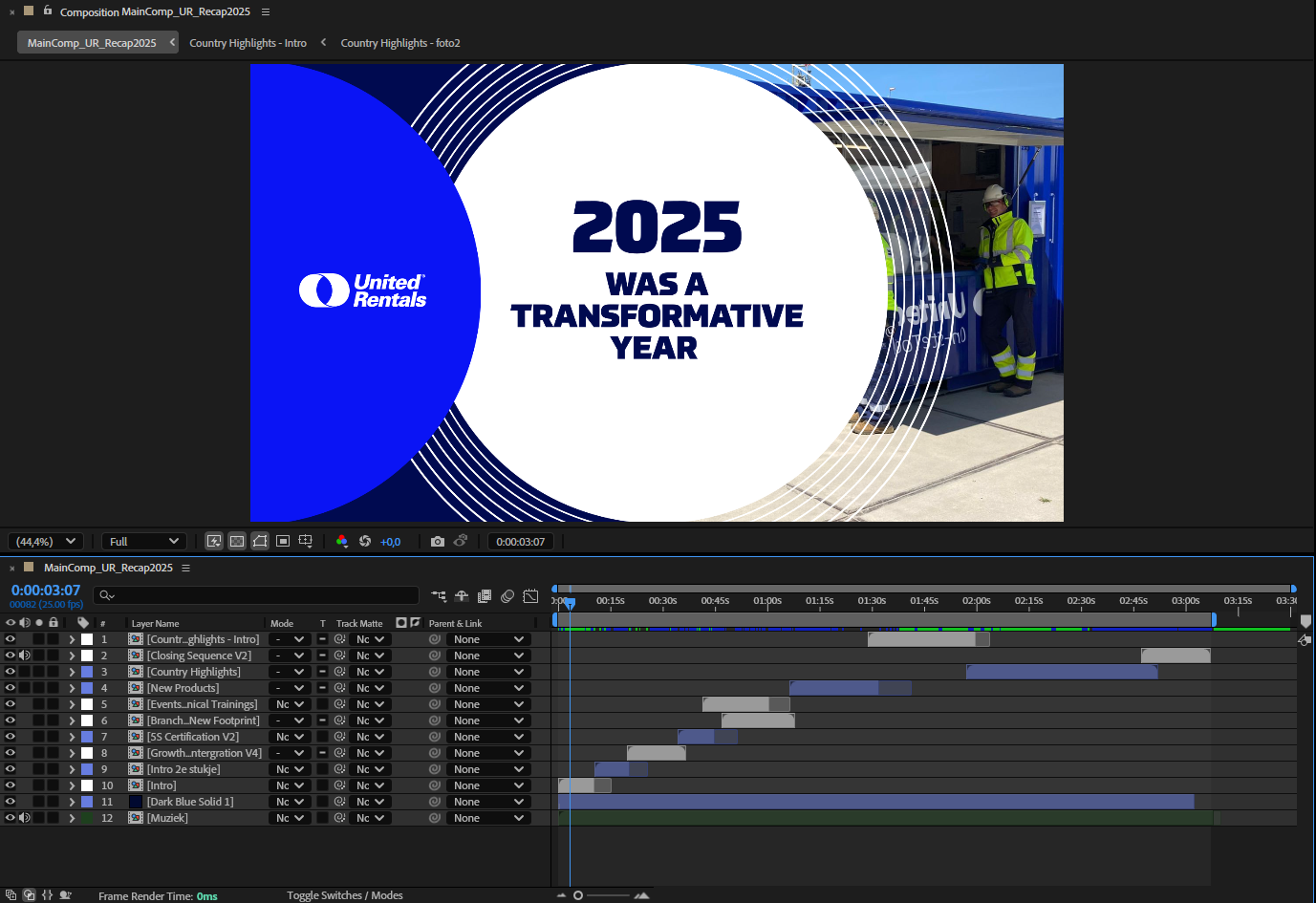 Daarna kreeg ik een nieuwe opdracht. Dit keer moest ik een recapvideo voor 2025 maken voor United Rentals. De video moet voornamelijk bestaan uit fotomateriaal, maar ook veel geanimeerde overgangen en tekstanimaties bevatten. Voor deze opdracht kreeg ik volledig zelfstandig de verantwoordelijkheid.