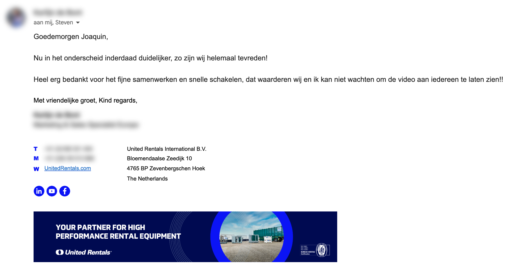 Donderdag ontving ik ook een reactie van United Rentals over de recapvideo. Hierop heb ik professioneel gereageerd en we verwachten maandag feedback.